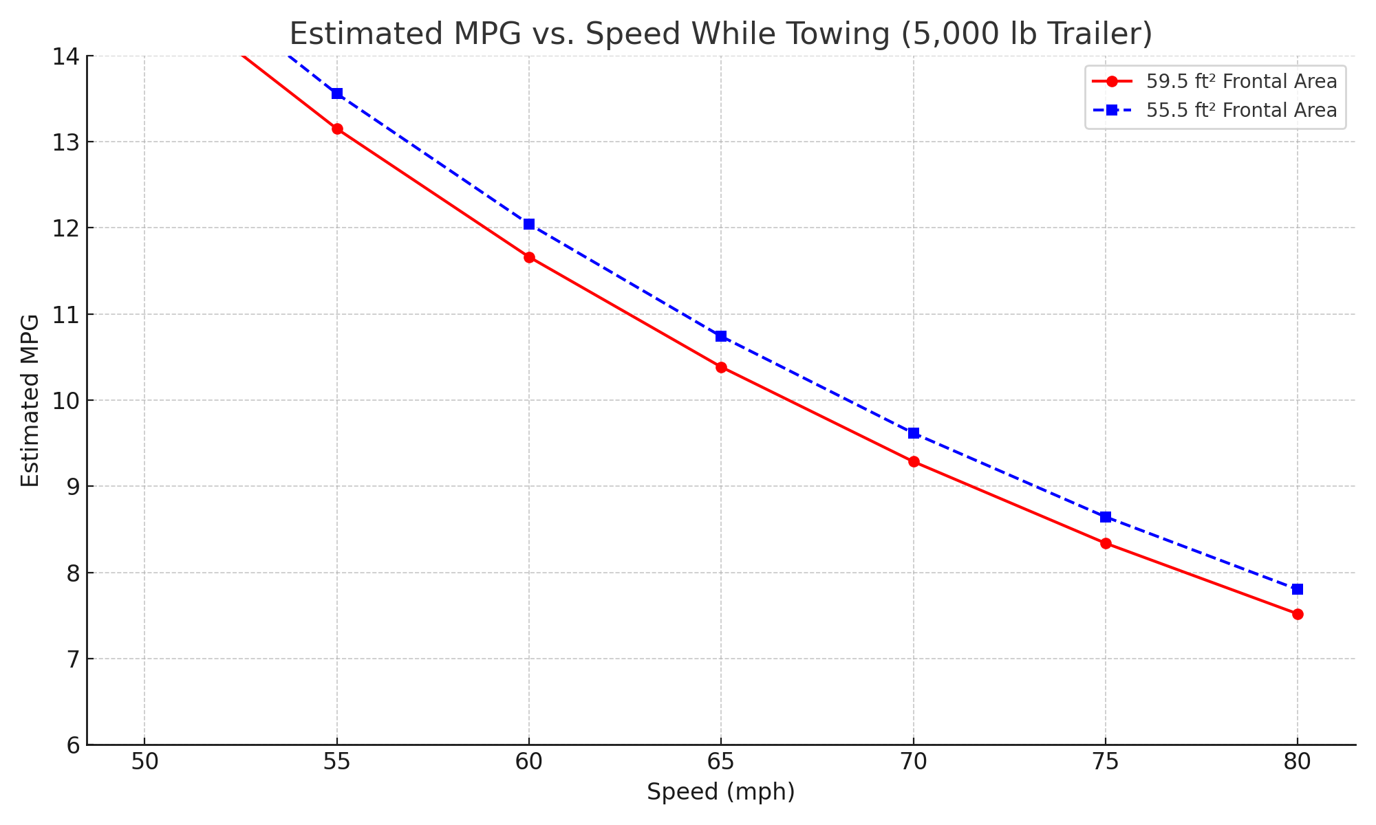 - I asked AI to provide a MPG / Speed chart using the surface area, and a 5,000 lb trailer (trailer + car). This didn't need to be exact, and, I know my car weighs more, but, AI determined that the rolling resistance doesn't affect MPG as much as wind resistance. It does, just not as drastic.